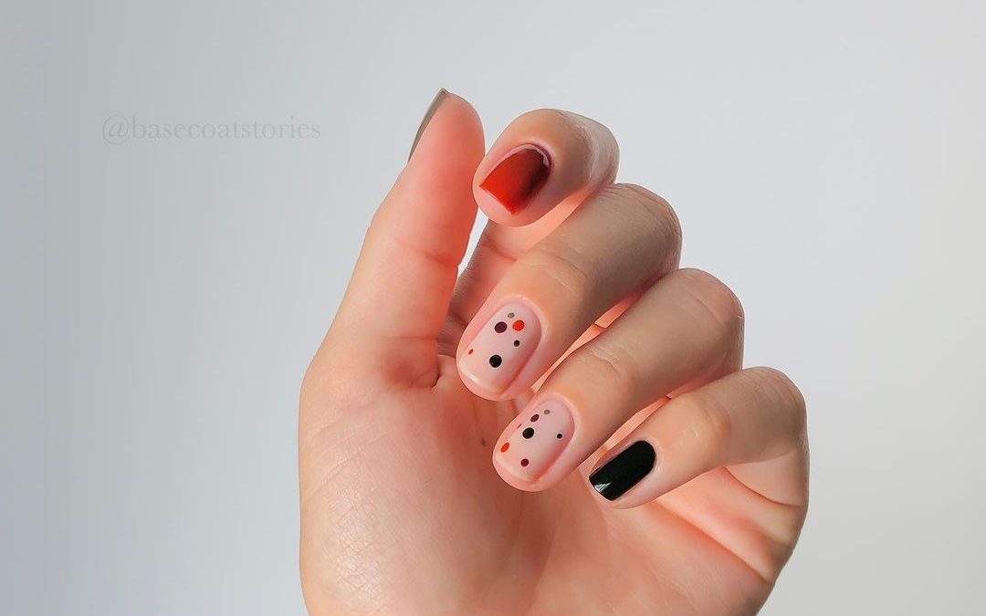 Alguns dias pedem uma opção rápida e sofisticada. Para eles, o terracota, preto e cinza são ótimos, ainda mais quando bolinhas são impressas em algumas unhas.