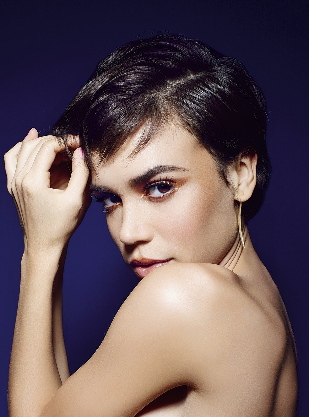 ao visual, combine produtos em pó (como a sombra) com outros cremosos (como o iluminador). Brinco de ouro, Epiphanie.