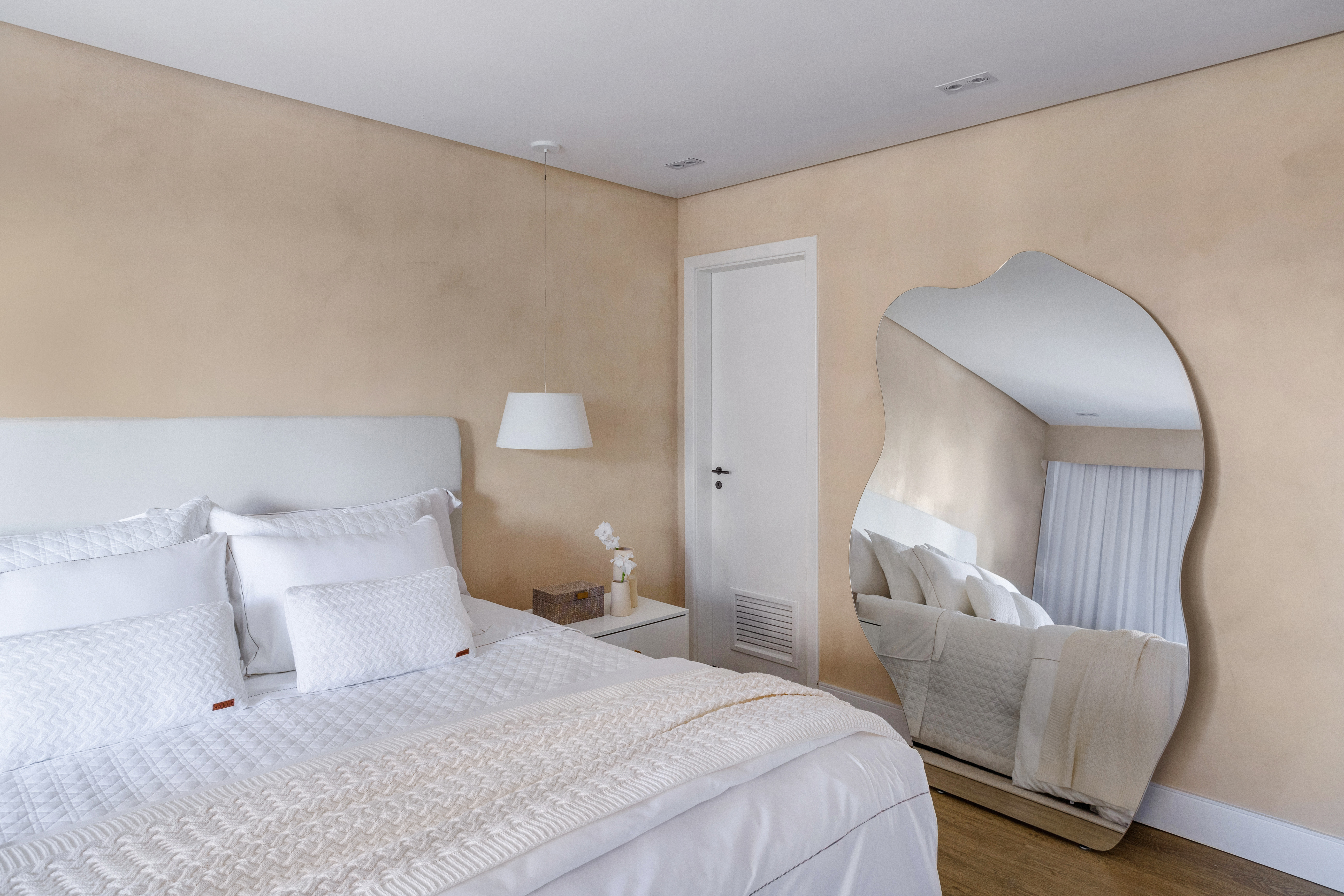 No projeto da arquiteta Daniela Funari, o generoso espelho orgânico equilibra a decoração de tons claros e linhas retas. O elemento reflete a luz natural que entra no ambiente e traz a sensação de amplitude à suíte.