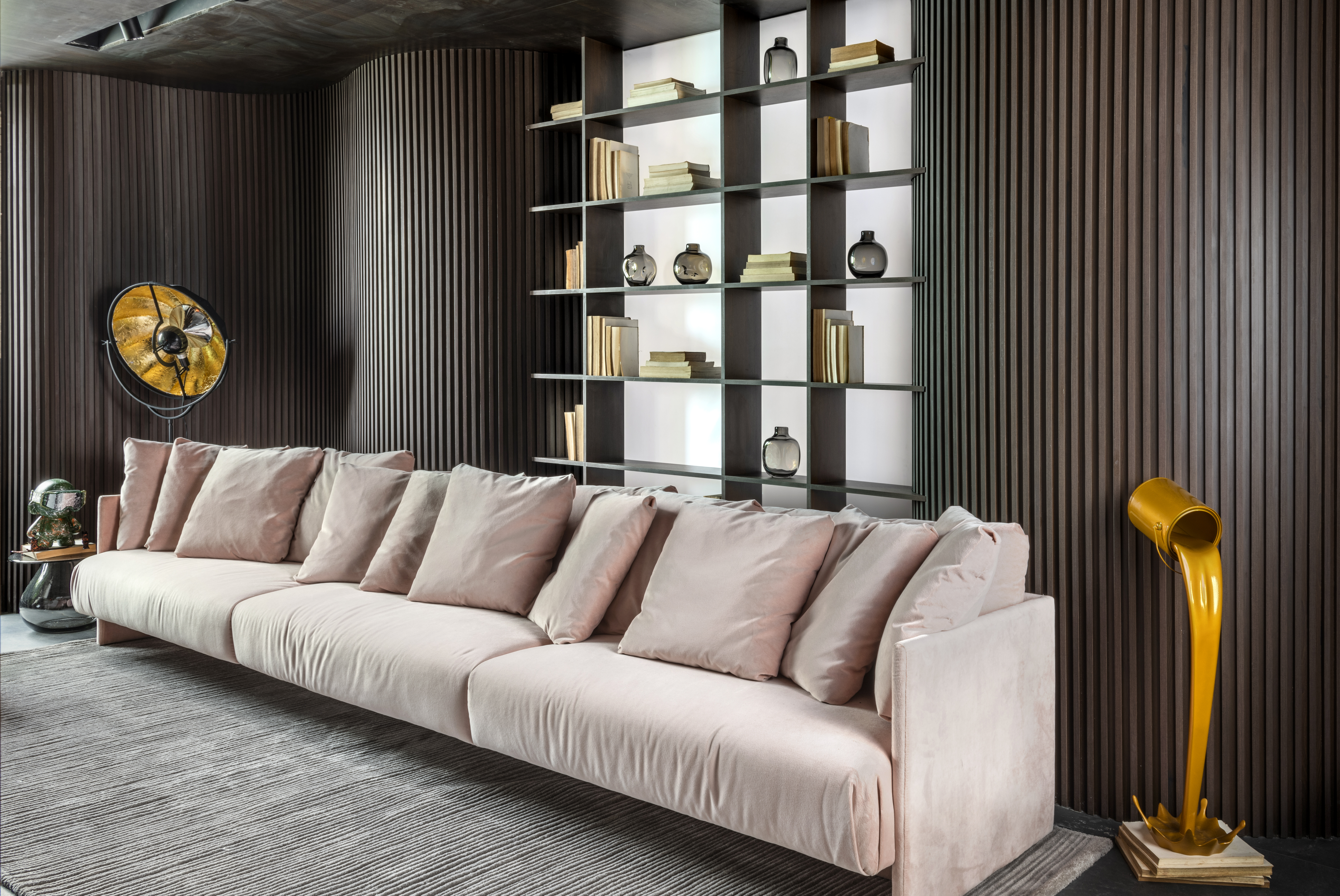 Para o mobiliário, Matheus escolheu peças com design marcante. Destaca-se o sofá de tom rosa suave, que traz um toque de leveza. Para complementar, a imponente poltrona Wing e a mesa Mush, criadas por Jader Almeida. Também chama a atenção a escultura-luminária desenhada por Matheus: um balde com tinta escorrendo pintado de dourado feito a partir de impressão 3D. A peça representa o transbordar de vida e felicidade em sua essência, segundo o designer.