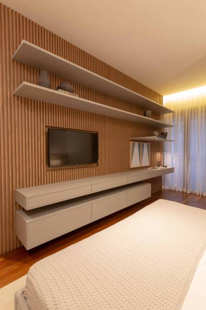 Mas o projeto da arquiteta Fernanda Cassou para o ROC (Residence Open Concept) Batel em Curitiba apresentou a solução perfeita para o problema: boa parte do espaço foi revestida com painéis de madeira padrão moscata.