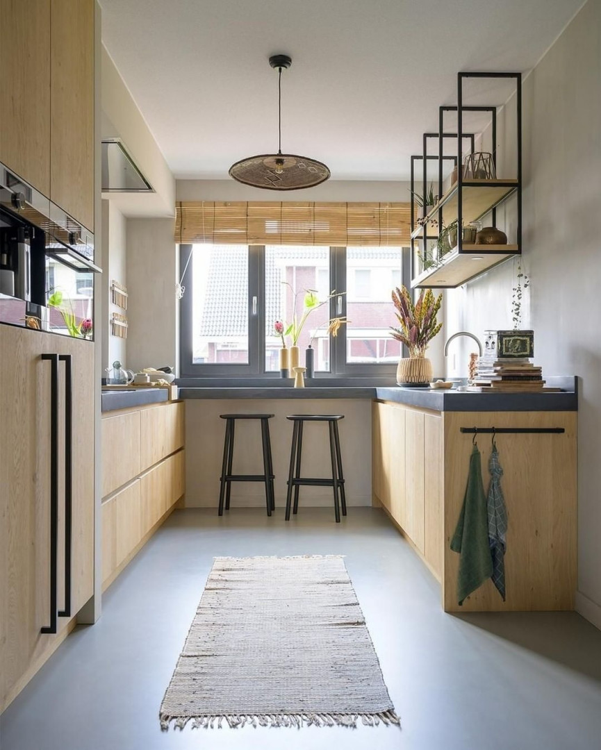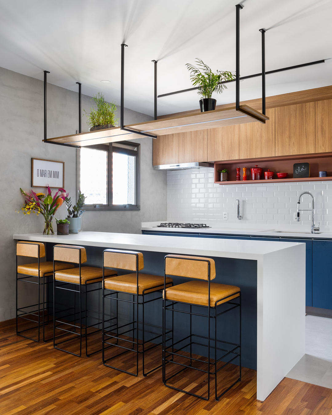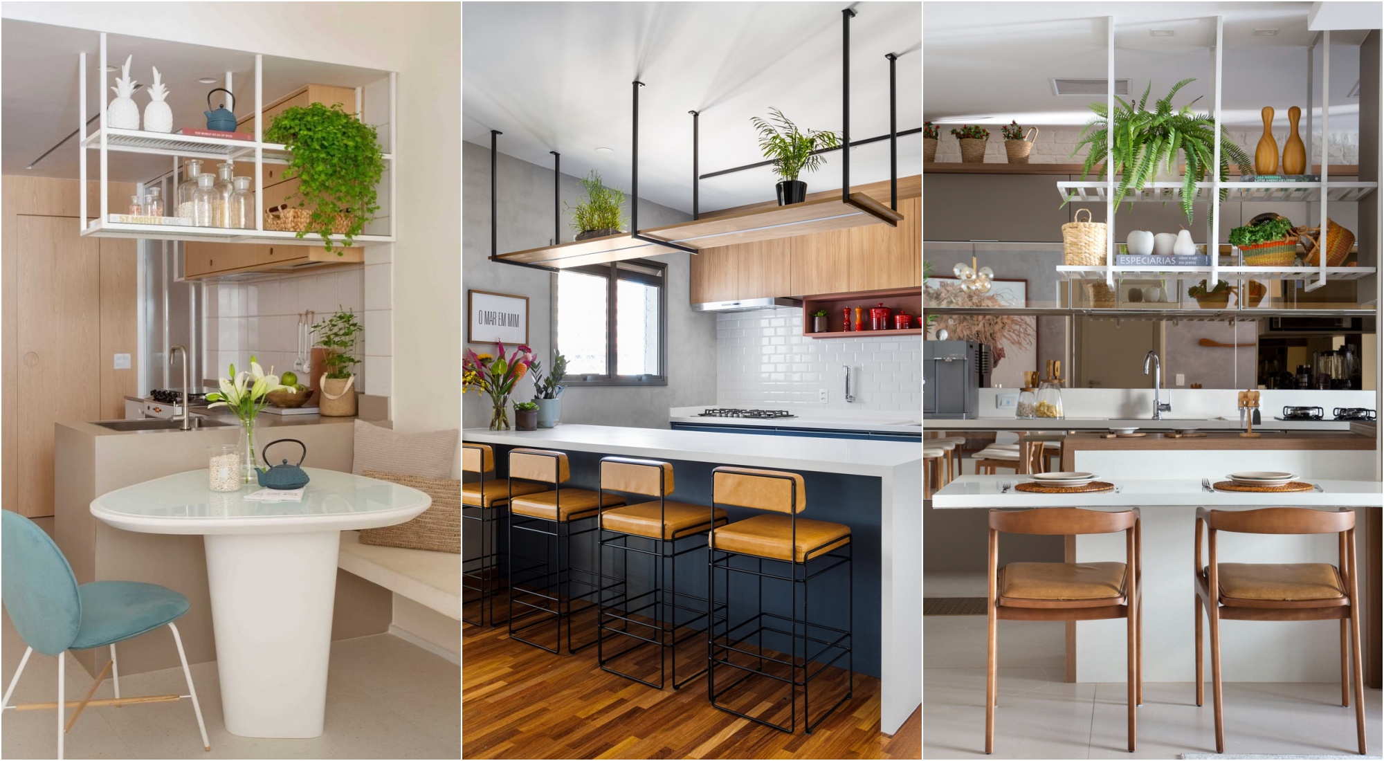 As cozinhas integradas com o living são um hit da decoração e com essa tendência surgiram alguns detalhes de marcenaria e serralheria que ajudam a organizar o espaço. Um deles são as estantes suspensas, que, além de deixarem o ambiente charmoso, trazem praticidade. Localizadas sobre a bancada, no alto, essa estrutura serve para acomodar as panelas do dia a dia, eletrodomésticos e até plantas. Inspire-se nos projetos que separamos logo abaixo!