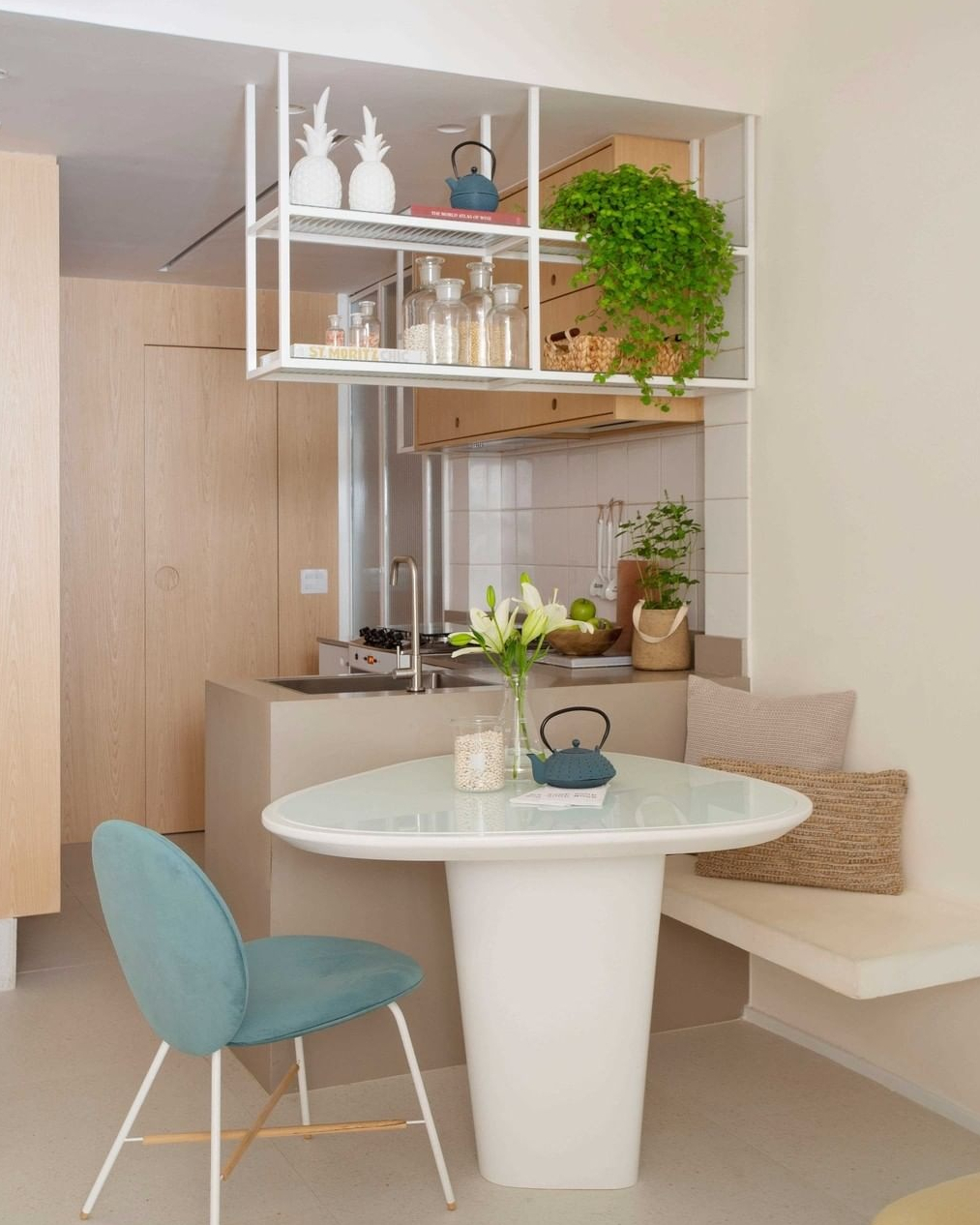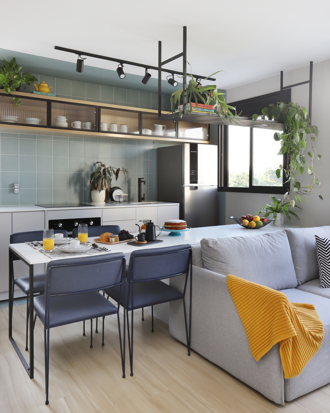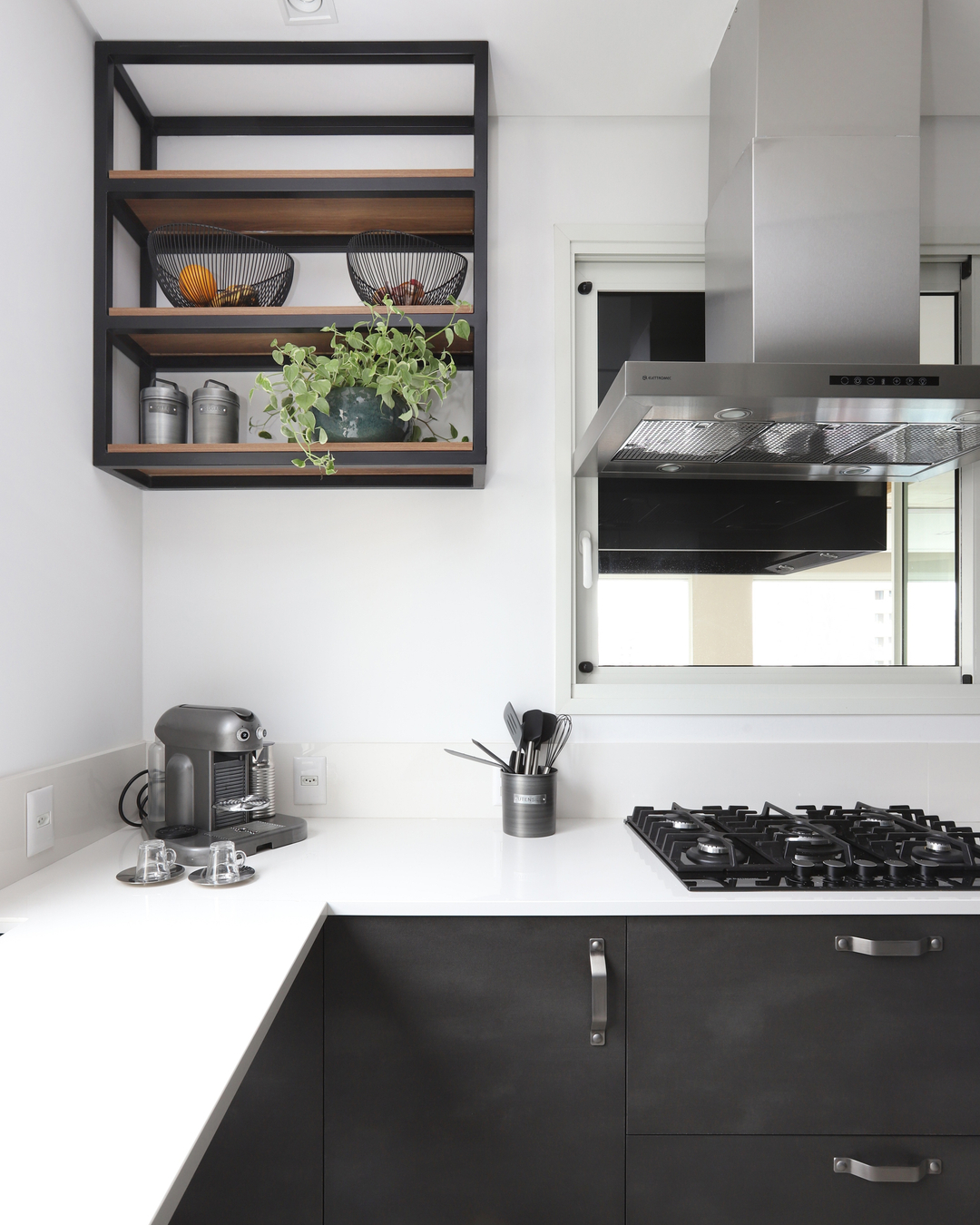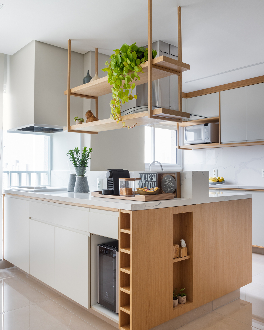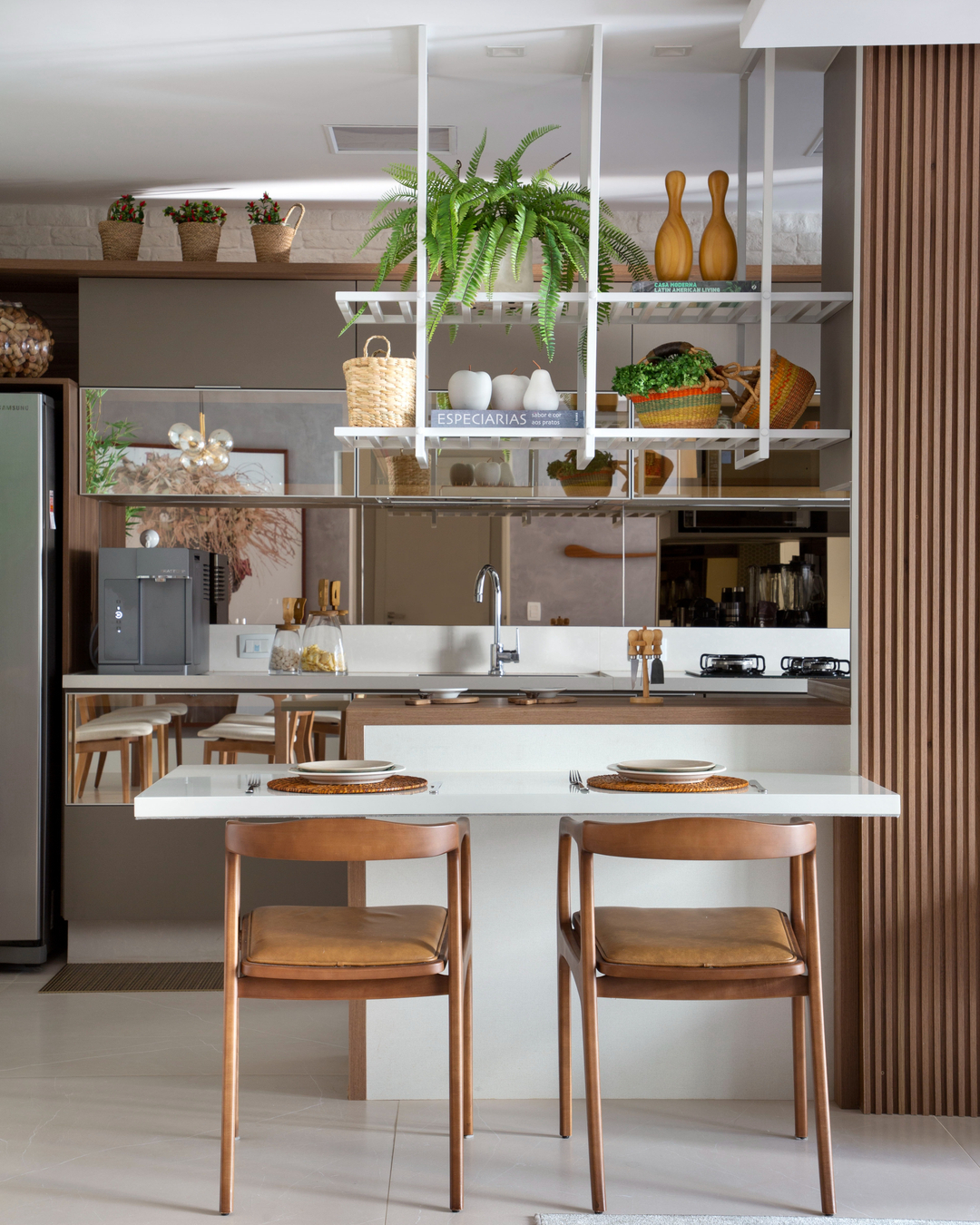 Nesta cozinha integrada e bem compacta, a estante suspensa, criada pelo arquiteto Gustavo Passalini, ajuda a demarcar o espaço e a organizar sem pesar na decoração. A pintura branca combina com a paleta do projeto e ajuda a deixar tudo mais leve.