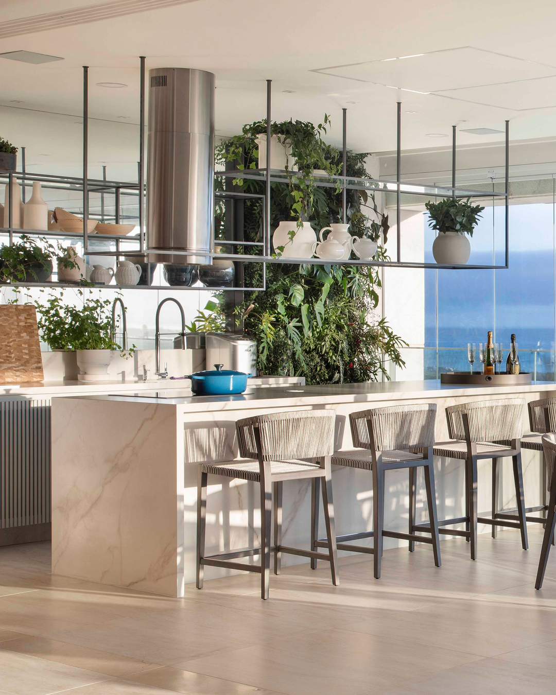 Esta cozinha integrada ficou ainda mais charmosa com as muitas plantas que a arquiteta Cristina Côrtes espalhou em vários cantos. Para isso, a profissional desenhou uma estante suspensa presa no teto que ocupa toda a área da ilha central. Neste espaço, além de plantas, peças de cerâmica ficam expostas.