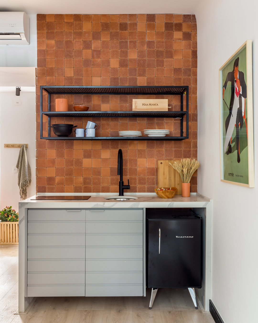 Do escritório Pilula Antropofágik, esta pequena cozinha ficou ainda mais organizada com uma estante de serralheria simples, acima da bancada. A estrutura trouxe mais um espaço de armazenamento e também leveza para o ambiente.