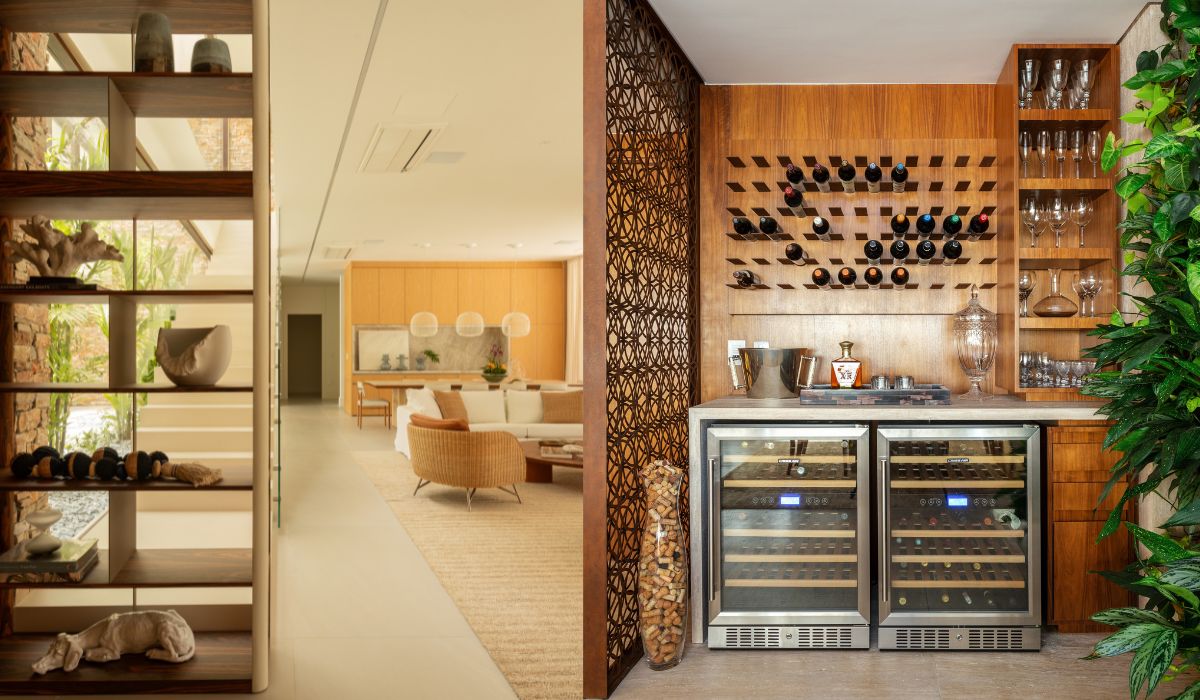 Neste projeto, as arquitetas criaram um biombo metálico para dividir a adega da entrada do lavabo. Como a área social e gourmet do apartamento é integrada, a proposta foi criar uma divisão sutil, que não bloqueasse totalmente a visão, mas garantisse a privacidade de cada ambiente.