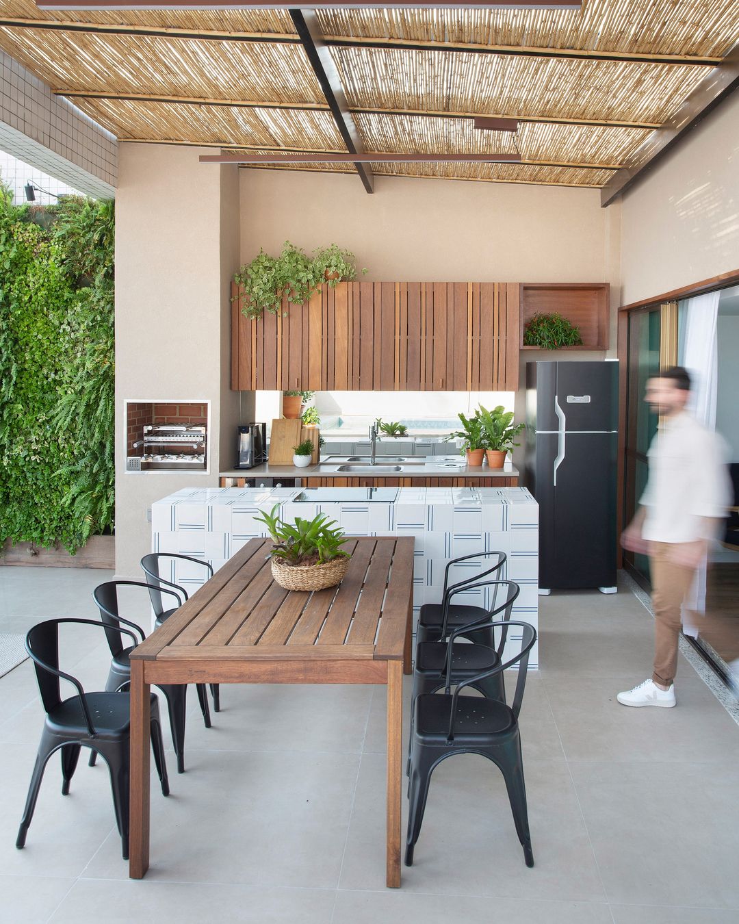 Madeira, jardim vertical e cobertura de bambu são os elementos que deixaram esta varanda, com projeto do A+G Arquitetura bastante aconchegante. Outro destaque do espaço é o balcão que foi revestido com azulejos estampados e por ter uma cor clara, trouxe leveza para o décor.