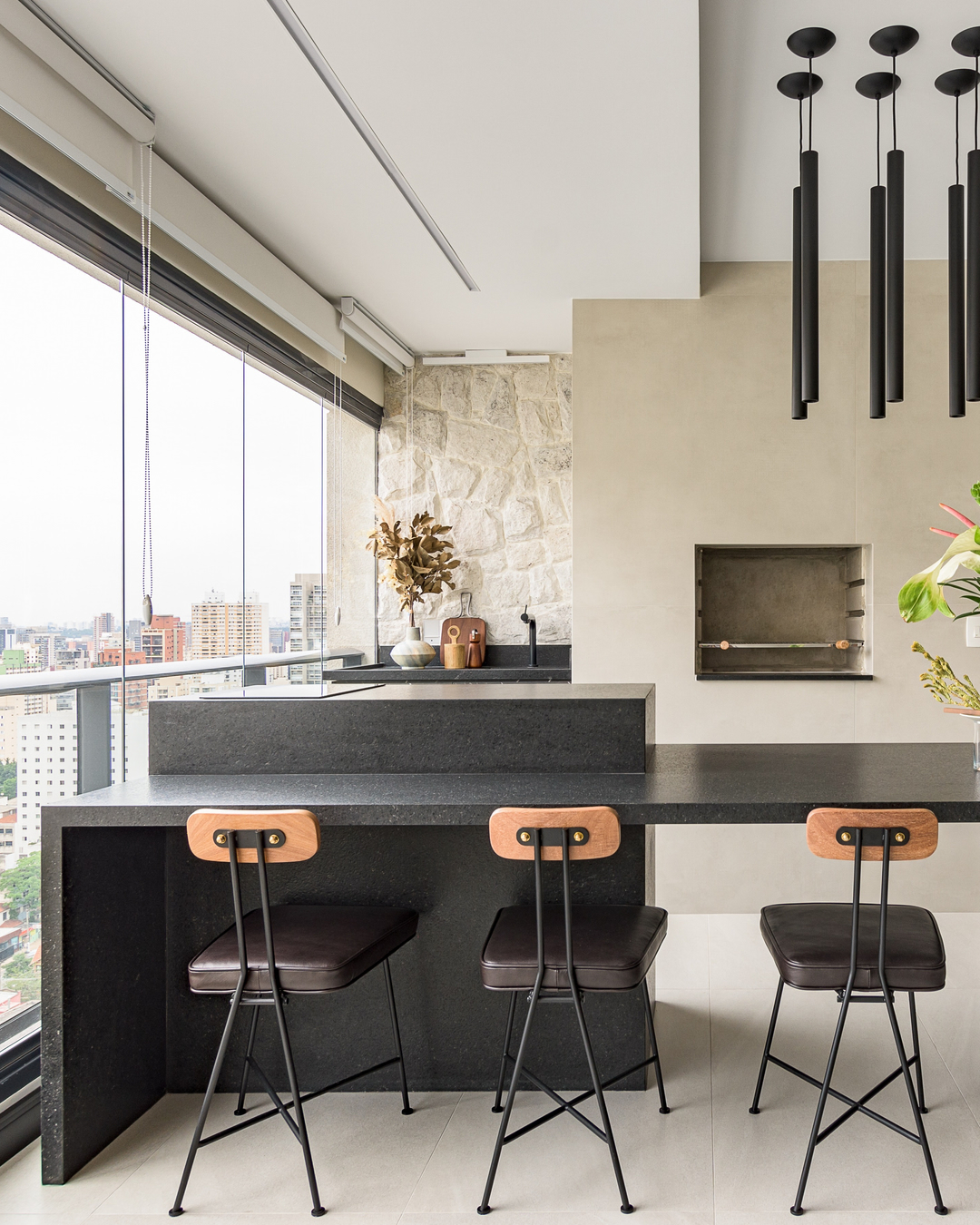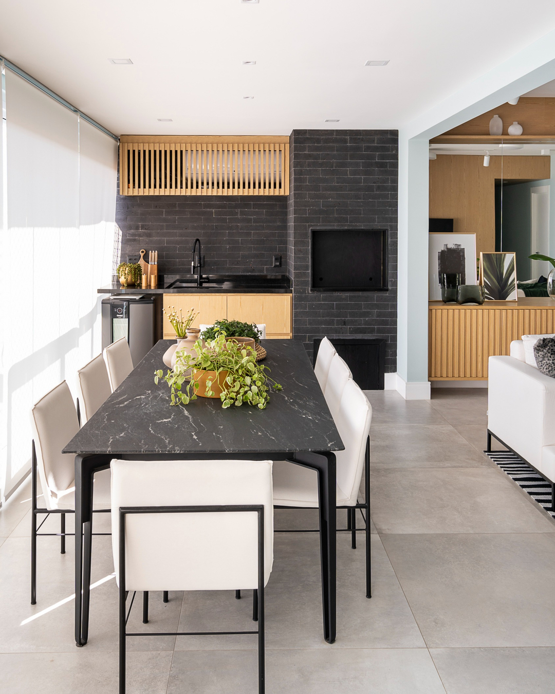 O contraste de claro e escuro foi a inspiração para a arquiteta Juliana Miranda desenhar esta varanda gourmet. Destacam-se os revestimentos da churrasqueira, bancada e tampo da mesa na cor preta. A madeira clara, o piso cimentício e o branco das cadeiras completam o visual.