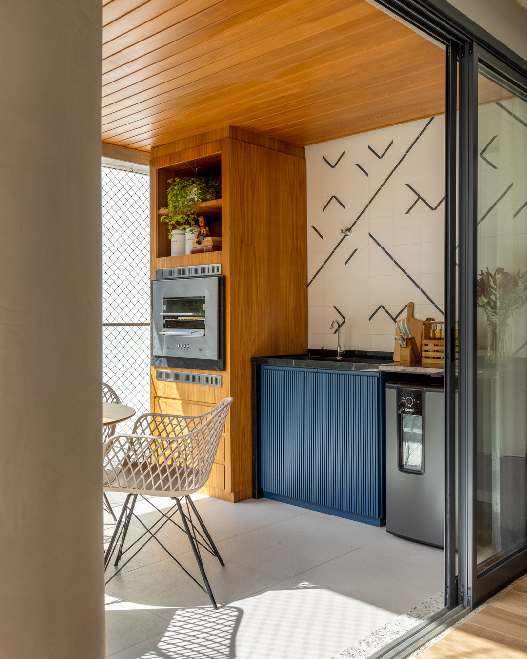 Nesta varanda gourmet, criada pelos arquitetos do escritório Páprica Arquitetura, destaca-se a marcenaria bem planejada. Repare na torre onde a churrasqueira elétrica foi instalada: na parte de cima há dois nichos de madeira e abaixo, mais três gavetas para armazenamento. Ao lado, os armários azuis conferem ainda mais charme ao décor.
