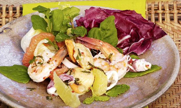 Tempere os frutos do mar com sal, pimenta-do-reino branca e azeite. Em uma frigideira com azeite bem quente, doure o camarão e a vieira por meio minuto. Resfrie.