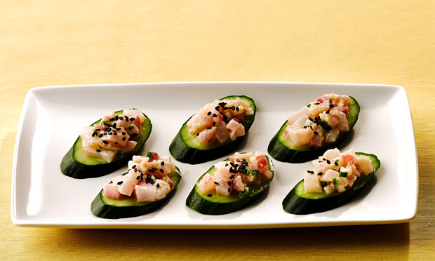 Leve à geladeira, coberto com filme plástico, por duas horas. Sirva o ceviche sobre as rodelas de pepino, polvilhado com o gergelim.