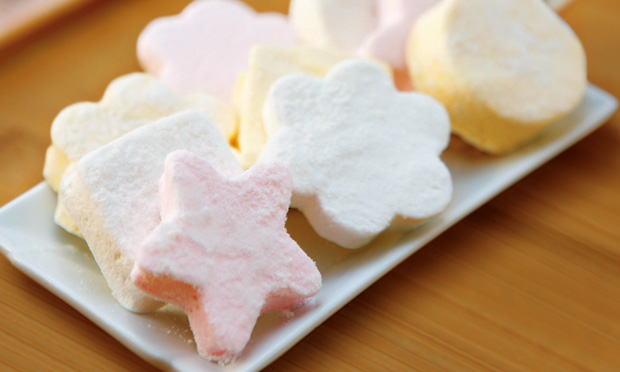 Num refratário, polvilhe a gelatina sobre a água. Reserve. Leve ao fogo o açúcar com a água, misturando até dissolver. Pare de mexer e deixe ferver até chegar ao ponto de fio grosso (ao pegar a calda com uma colher, ela deve cair como um fio encorpado). Reserve. Dissolva a gelatina em banho-maria ou no micro-ondas por 20 segundos, em potência alta. Depois transfira para a tigela da batedeira e bata em velocidade média. Junte a calda fervente, em fio, e aumente a velocidade. Bata por cerca de dez minutos ou até ficar firme. Adicione o corante alimentício. Enquanto isso, unte uma forma com glucose de milho e polvilhe fartamente o açúcar. Coloque a massa na assadeira, alisando com uma espátula. Deixe esfriar por duas horas. Desenforme sobre as costas de outra forma polvilhada com mais açúcar e use um cortador de biscoitos para moldar o marshmallow.