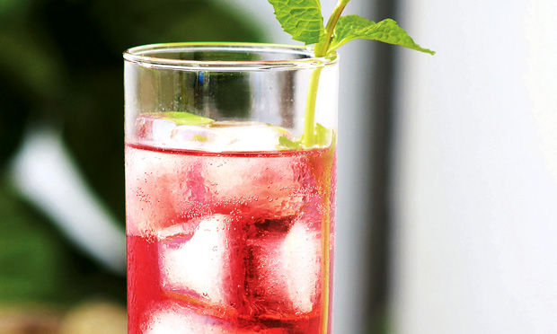Num copo alto coloque até a metade o gim e depois o curaçao. Misture levemente e complete com a água tônica. Enfeite com o ramo de hortelã.