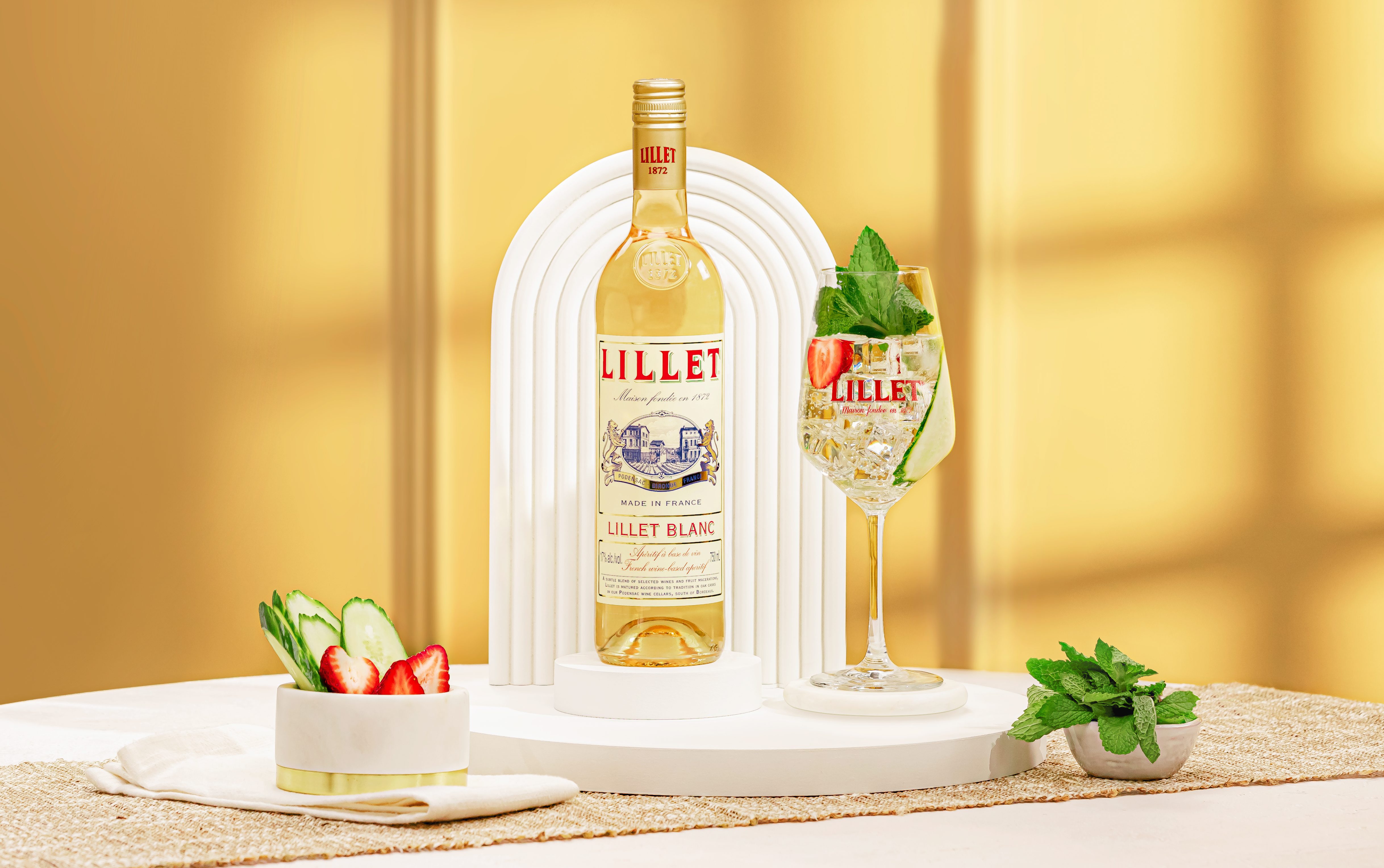 Modo de preparo: em uma taça com gelo, adicione Lillet Blanc. Em seguida, coloque a água tônica e guarneça com as fatias de pepino, morango e o ramo de hortelã.
