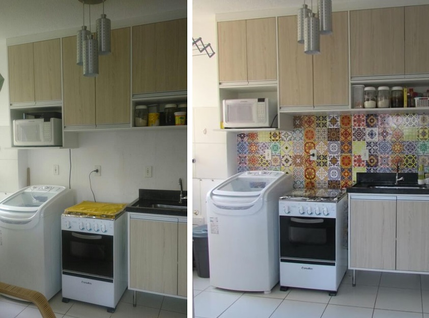 A mudança para o apartamento próprio aconteceu em 2014 e, para personalizar seu novo cantinho, a professora de artes Juliana Saad pôs a mão na massa e tratou sozinha da decoração: seus quadros pintados à mão enfeitam as paredes do estar e personalizam o espaço que divide com seu marido e seu filho de 1 ano, em Manaus (AM). Se as superfícies brancas não tiveram vez na sala, o revestimento clarinho da cozinha também não passou batido: para dar cor ao espaço e evitar o quebra-quebra, a solução foi encomendar um adesivo em uma gráfica e colar diretamente na parede. “Escolhi essa estampa, de azulejo português, porque sempre gostei e acho diferente”, explica Juliana.