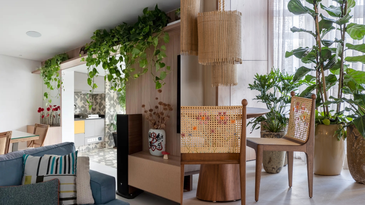 Além de agregarem visualmente, as plantas são um recurso para melhorar a qualidade do ar e refrescar o ambiente. A designer de interiores explica: “Elas aumentam a umidade, filtram o ar e reduzem a temperatura local. Próximas às janelas e na rota do vento, funcionam como um ‘ar natural’”, diz.