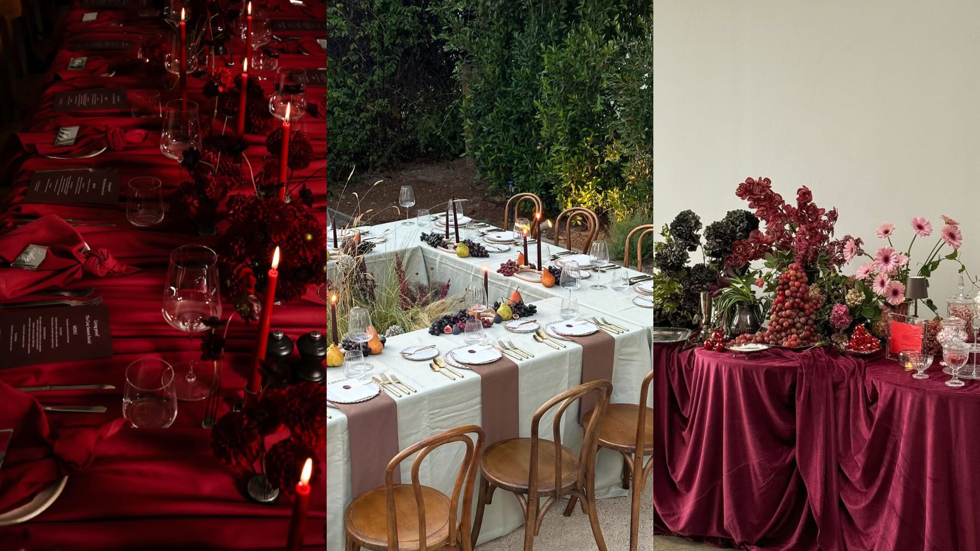 Para completar a atmosfera, escolha pratos brancos ou vermelhos, com taças transparentes e guardanapos de tecido vermelho. Como ponto-chave da composição, objetos, frutas e flores vermelhas, como maçãs, cerejas e poinsétias, vão intensificar ainda mais o clima. Espalhe tudo de forma orgânica, criando um caminho de mesa.