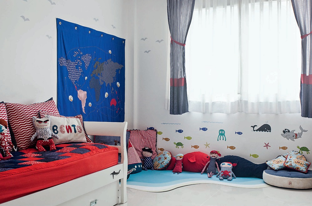 º Pirata que se preze vive no mar. Por isso, Bento ganhou um pra chamar de seu: as designers criaram um tapete feito de PVC com impressão digital em três cores, recortado a laser (Nina Moraes). E, para deixar o canto mais confortável e divertido, costuraram almofadas de diferentes tamanhos e formatos. Na parede, o xodó do pequeno é um mapa (90 x 60 cm), feito de tecido, no qual ele cola seus barcos sinalizando por onde já passou. E, reforçando o tema, as paredes ainda são repletas de adesivos de baleias, tubarões, peixes e gaivotas (Kit Fundo do Mar Menino. Stixx).