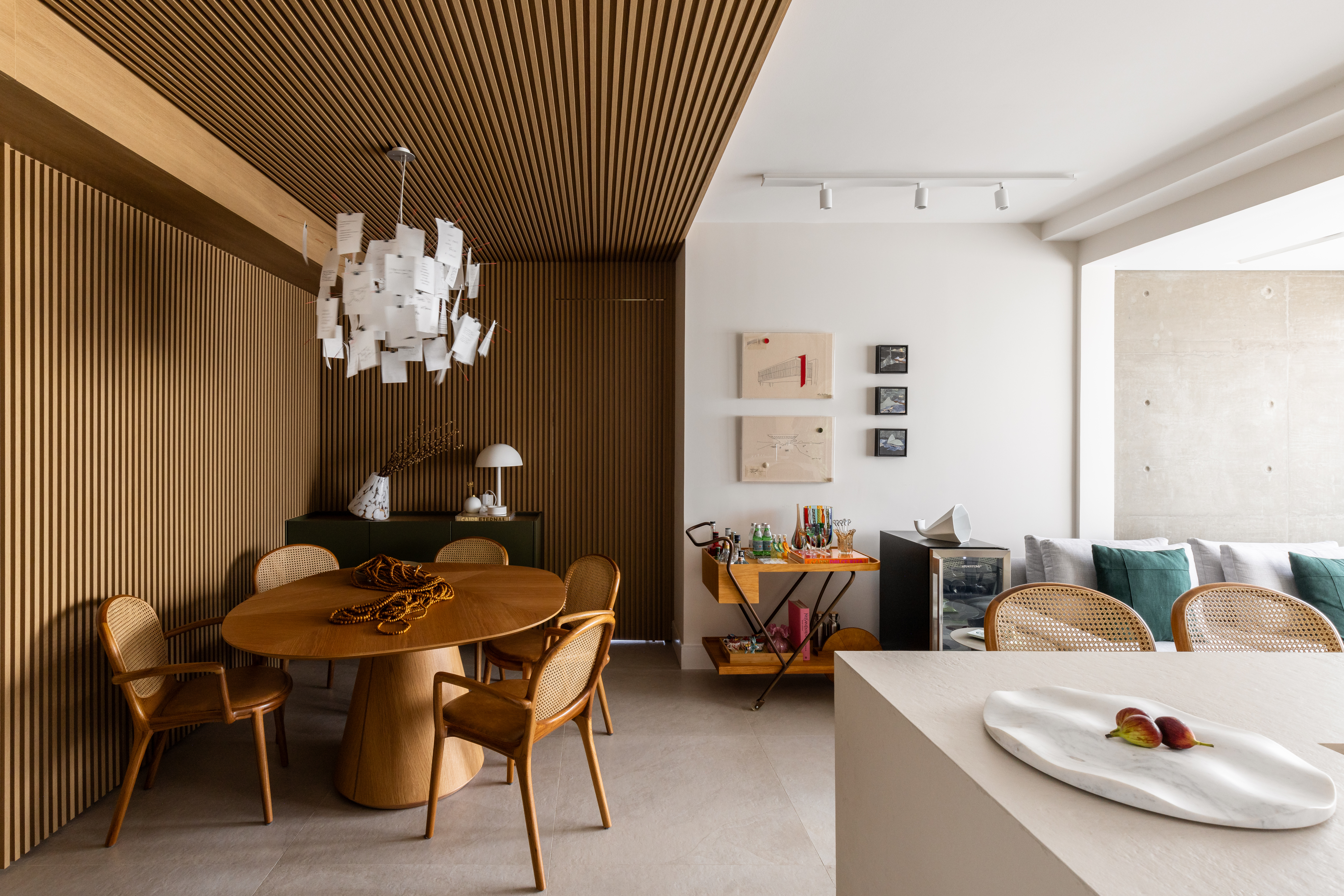 Segundo os arquitetos Mariana Meneghisso e Alexandre Pasquotto, do escritório Meneghisso & Pasquotto Arquitetura, o olhar horizontal favorece espaços pequenos. “Elementos horizontais como prateleiras e móveis baixos criam amplitude.” Eles ainda usam rodapés baixos ou pintados no mesmo tom da parede — tudo para manter a fluidez visual.