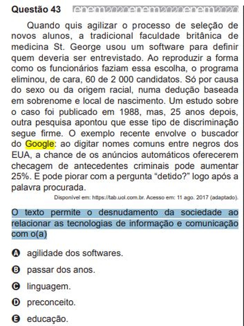 Em seguida, o exame pergunta: “O texto permite o desnudamento da sociedade ao relacionar as tecnologias de informação e comunicação com o(a)…”. Apesar da maioria das correções indicar a alternativa que fala de preconceito, o primeiro gabarito divulgado pelo Inep apontava “linguagem” como resposta certa.