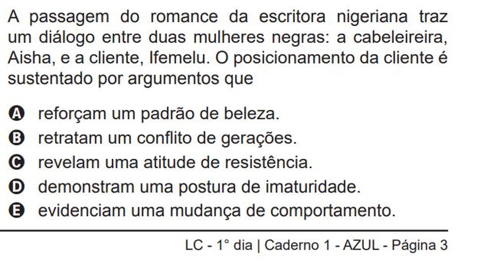 A prova pede, então, que o candidato classifique os argumentos de Ifemelu. Para muitos que prestaram o exame e professores que corrigiram as provas, a resposta certa seria a alternativa C (“revelam uma atitude de resistência”). Contudo, no gabarito oficial, a alternativa D (“demonstram uma postura de imaturidade”) foi marcada como correta.