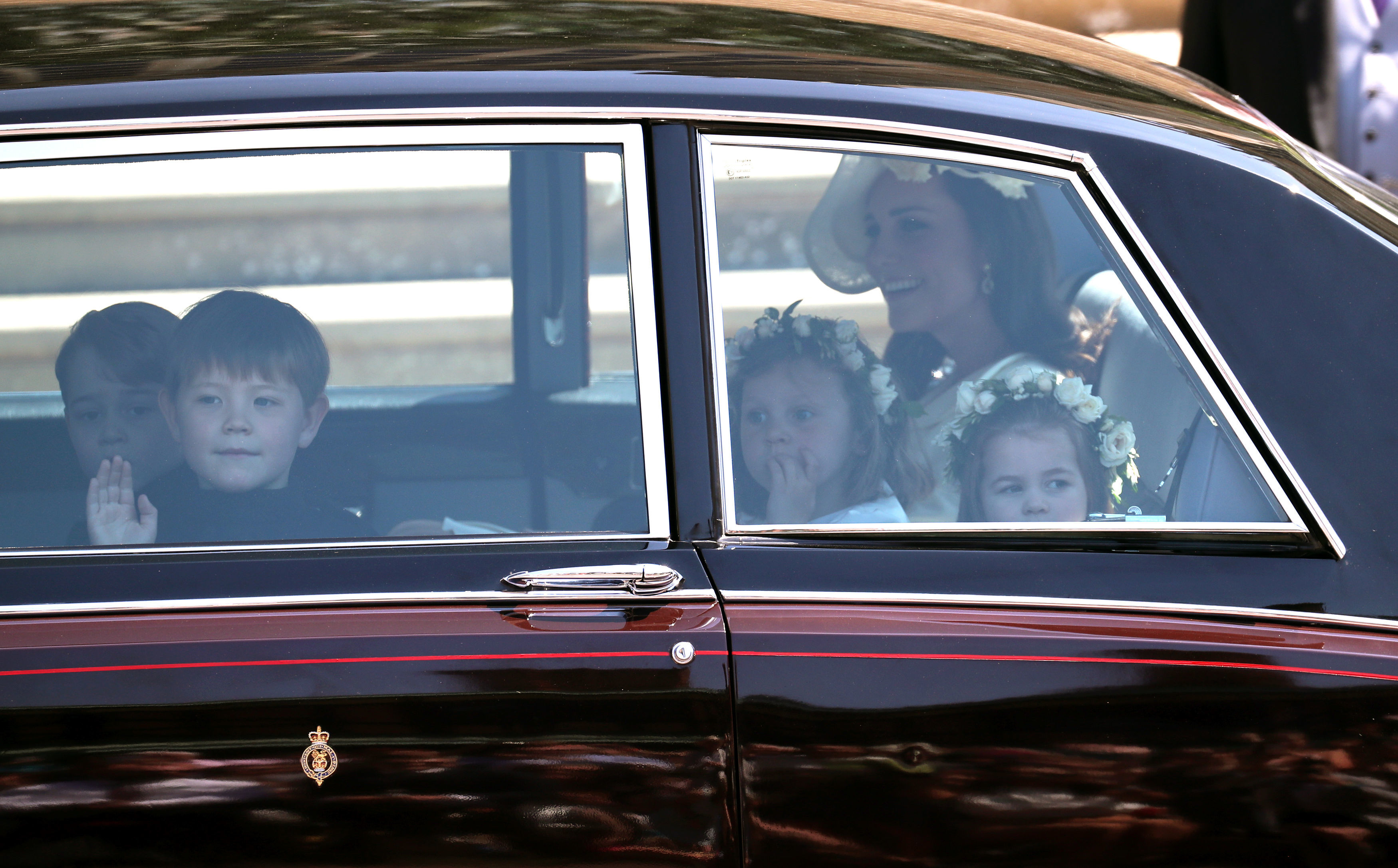 A Duquesa de Cambridge, Kate Middleton, esposa do príncipe William, chegou acompanhada dos filhos George e Charlotte, que são pajem e daminha com outras oito crianças no casamento de príncipe Harry e Meghan Markle. Kate veste um vestido marfim.