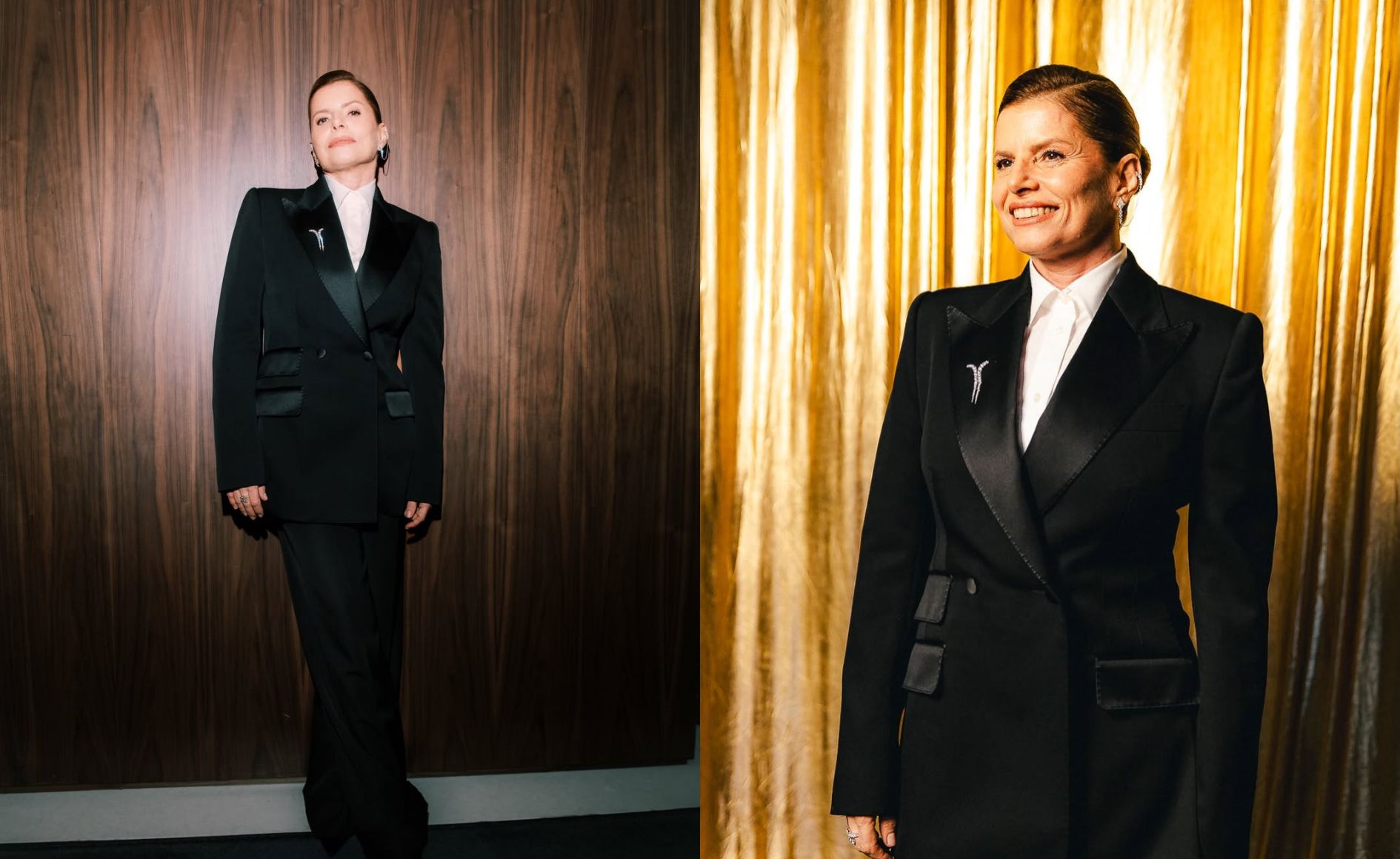 A ausência de excessos também chama atenção. A escolha da atriz é que beleza, acessórios e roupa não disputem a atenção, optando por uma maquiagem mais natural. Assim, pequenos detalhes ganham destaque, como o broche, enquanto a alfaiataria permanece como foco.
