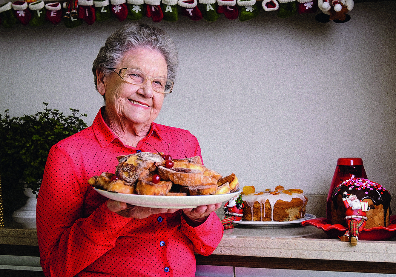 Natal sempre foi sinônimo de rabanada! E Palmirinha Onofre, 83 anos, sabe bem disso. Quando criança, ela se reunia com a família em seu sítio na cidade de Bauru, interior de São Paulo, para fazer uma grande ceia.”Na época, não existia leite condensado e minha mãe batia o leite com açúcar até virar um creme. Fazíamos a rabanada com vinho também. Fica uma delícia”, conta. Palmirinha lembra que ela e os irmãos ganhavam tecidos iguais. “Não tinha presente. Era pano para fazer vestido e camisas”, diverte-se. Hoje, a ceia acontece em sua casa, em Alphaville.