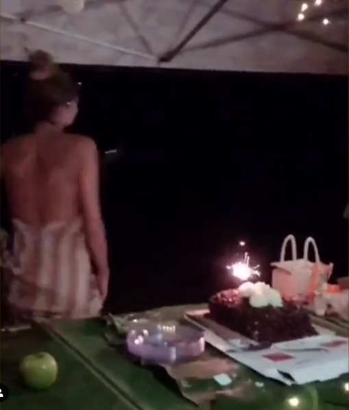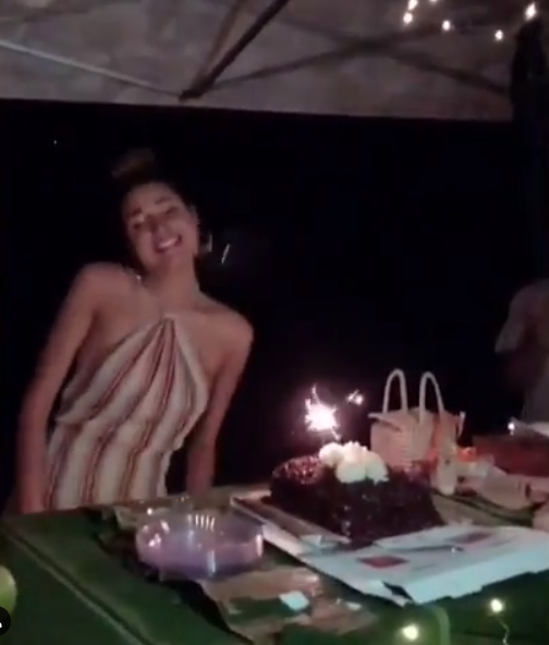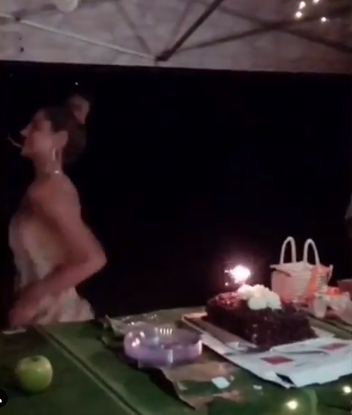 Sem grandes luxos, ela apareceu pulando em frente a um bolo bem simples, ainda em cima da caixa e ao lado de pratos plásticos, enquanto o grupo cantava parabéns.