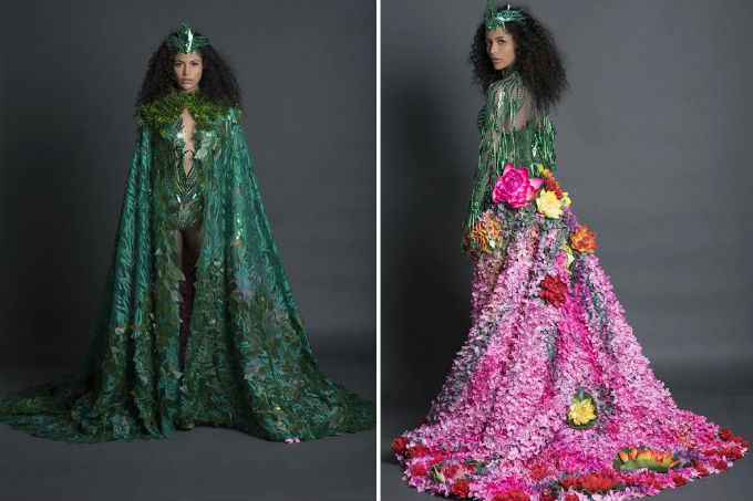 Batizado de Deusa Protetora da Natureza, o look de duas peças – uma capa verde e um body com cauda de flores – levou um mês para ser produzido.