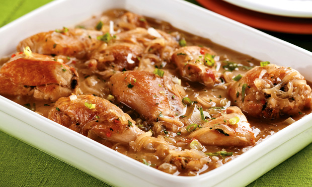 Frango acebolado no molho de vinho