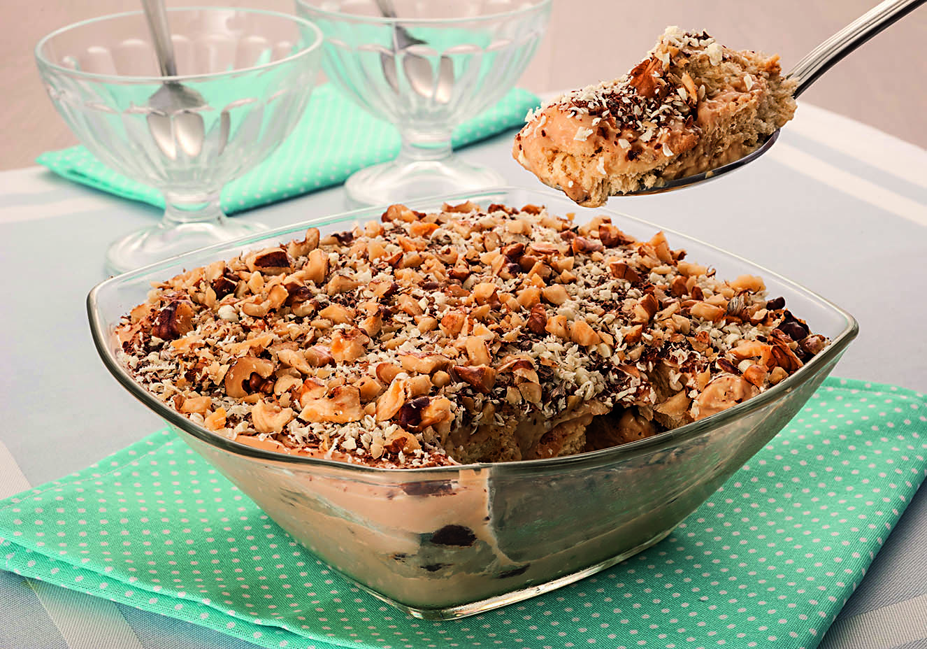 Derreta o chocolate em banho-maria. Acrescente 1/2 xícara de chantilly, o café e misture. Em taças ou refratário, monte camadas de chocotone, creme e morango. Decore com o chantilly restante.