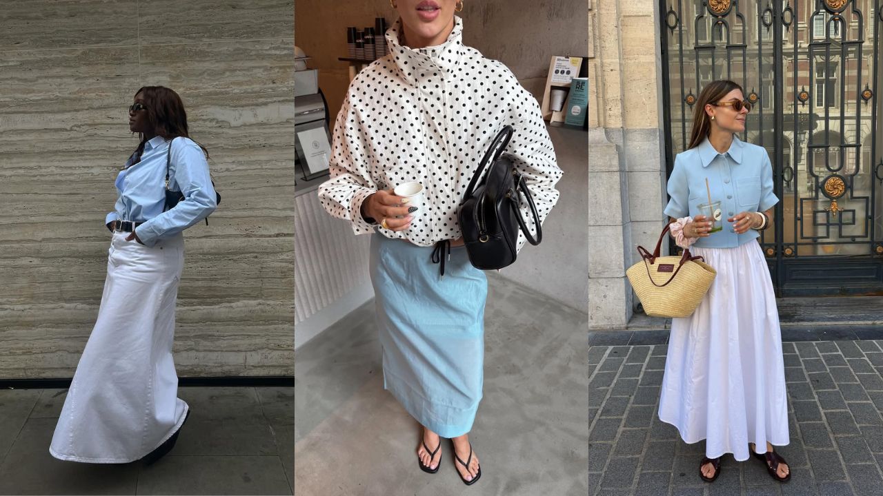 Combinada com uma saia longa branca de corte fluido, a produção ganha um ar sofisticado e atemporal. O cinto preto marca a cintura e acrescenta contraste, enquanto a bolsa pequena mantém o visual refinado e funcional.