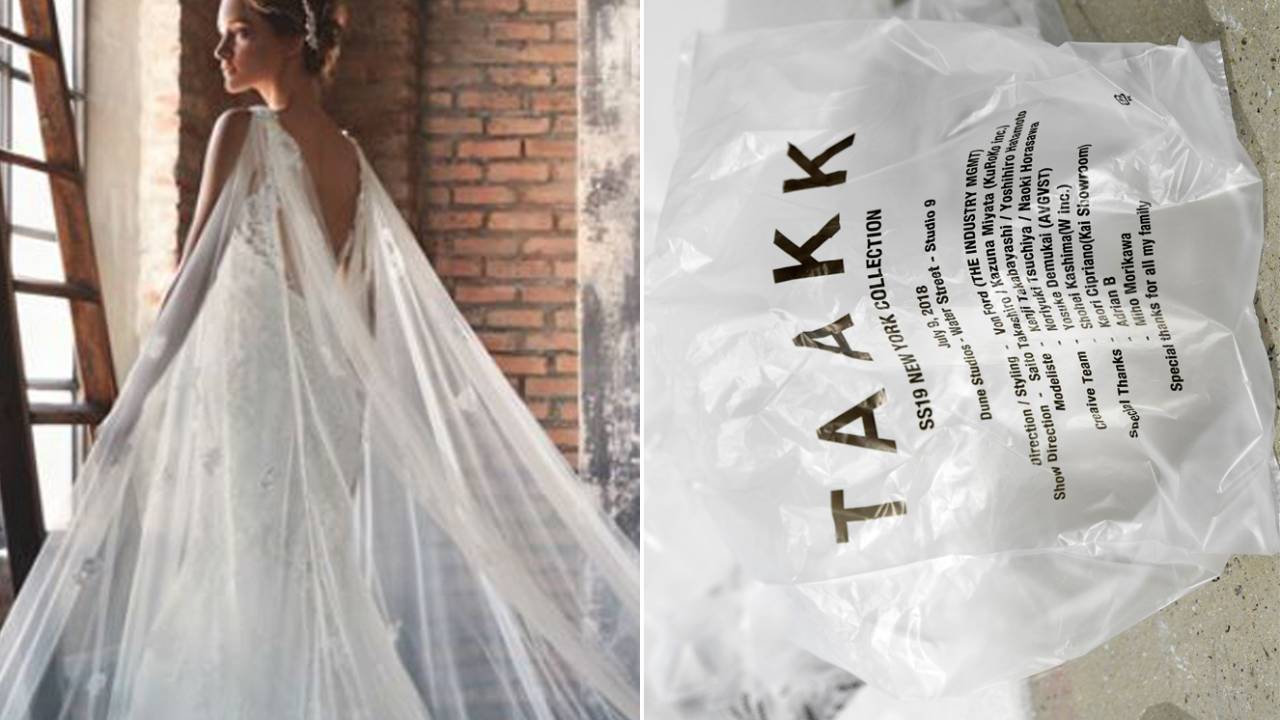 Plástico é o material escolhido por estilista ao criar vestidos de noiva