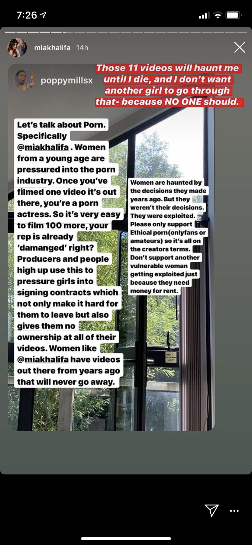 “Por favor, pense sobre isso se está considerando a indústria do sexo. Eles tornam impossível retificar seus arrependimentos, caso os tenha no futuro”, disse ela em um post no Twitter. “Aqueles 11 vídeos me assombrarão até a morte e eu não quero que outra garota passe pelo que eu passei – porque ninguém deveria”, escreveu também em um story.