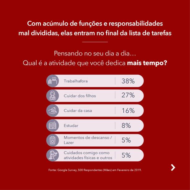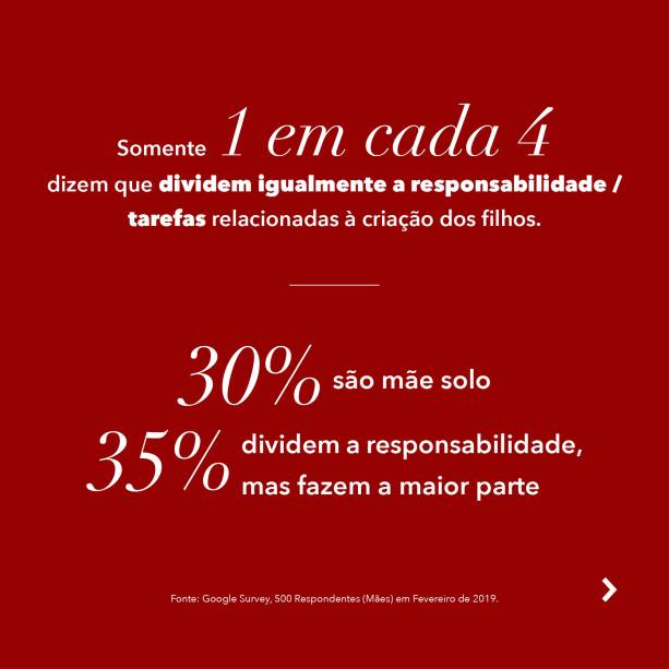 Apesar de agora assumirem papéis que antes eram menos comuns para as mães, como o trabalho fora de casa e os estudos, a responsabilidade que as mães brasileiras têm em casa não mudou. Elas continuam sendo as principais ou as únicas responsáveis pela criação dos filhos. 30% delas são mãe solo e apenas 1 entre 4 afirma que divide igualmente as responsabilidades na criação dos filhos.