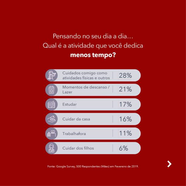 Com cada vez mais tarefas, ter tempo para cuidar de si mesma é a atividade menos praticada pelas mães brasileiras, de acordo com o estudo. Quase 30% dessas mulheres afirmam que atividades físicas e o autocuidado estão no fim da sua lista de prioridades. No topo dela estão o trabalho e o cuidado com os filhos.