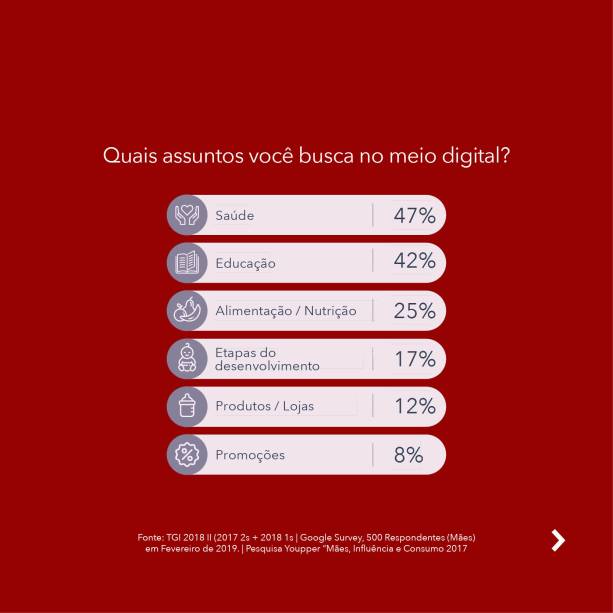Quase metade das entrevistadas diz que busca informações sobre a maternidade na internet e 75% afirmam que querem ler e ver experiências reais, por isso recorrem a blogs, fóruns e redes sociais.