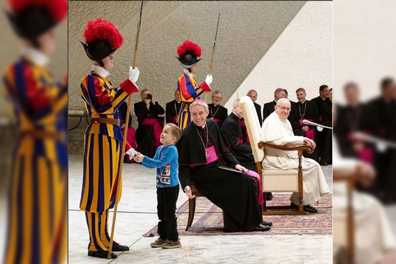 Criança com autismo brincou com guarda suíço no palco e divertiu o Papa