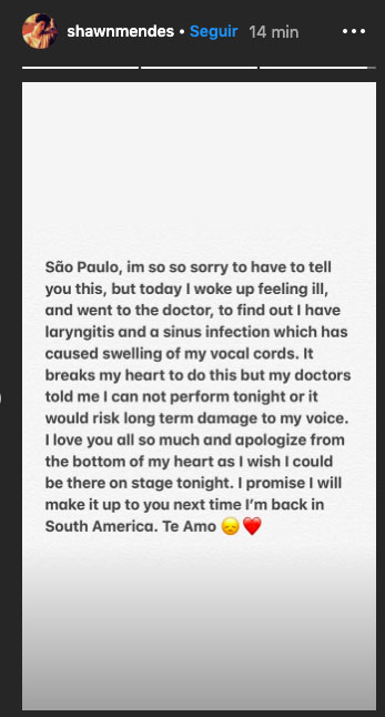 “São Paulo, peço muitas desculpas mas hoje acordei me sentindo mal e fui ao médico que diagnosticou que estou com laringite e sinusite, inflamando as minhas cordas vocais”, ele explicou. “Me parte o coração mas os médicos me disseram que se eu insistir e cantar posso prejudicar minha voz em longo termo. Do fundo do coração queria me apresentar hoje. Prometo me redimir na próxima vez que voltar à América do Sul. Te amo”, prometeu.
