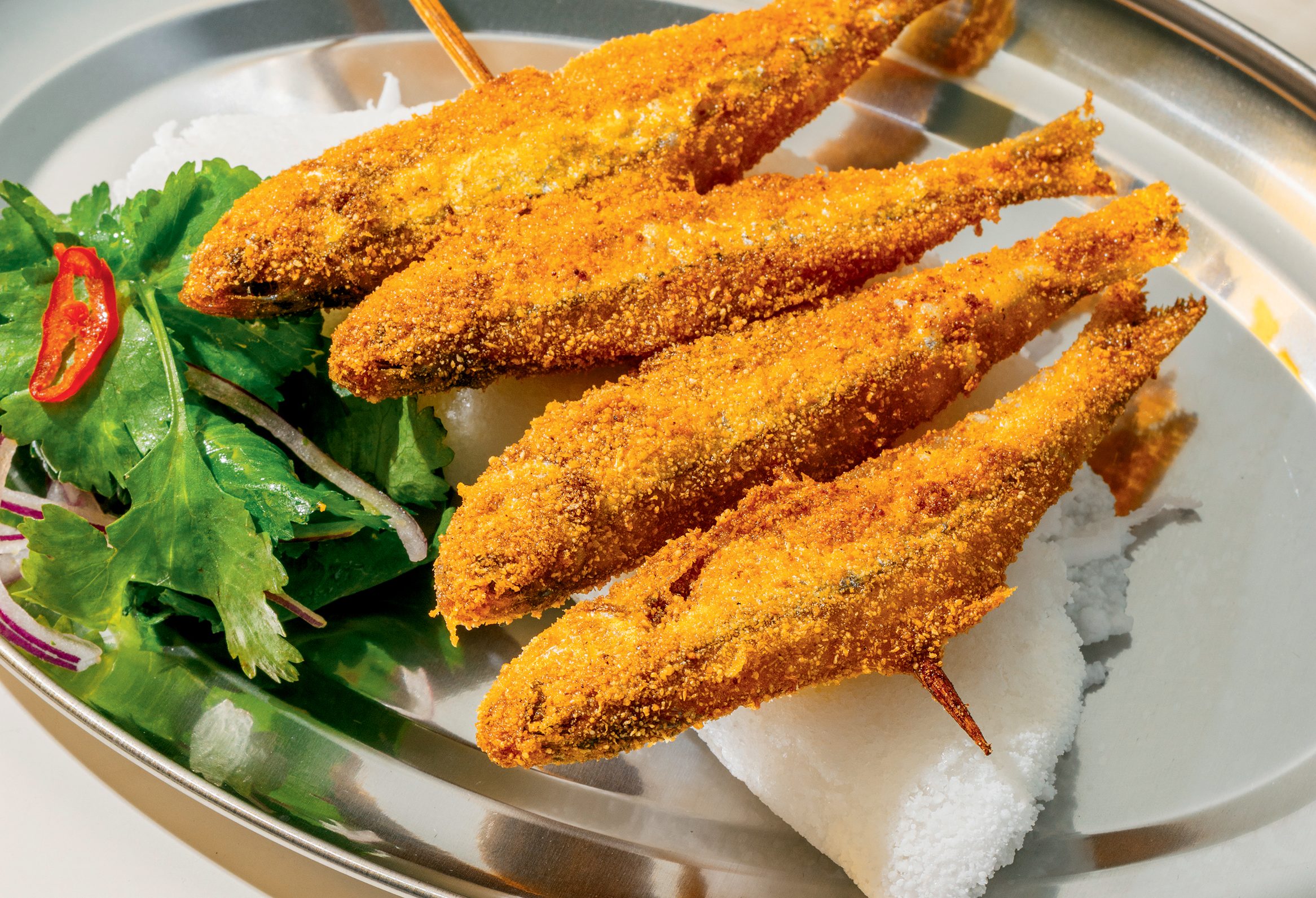Ginga com tapioca (sanduíche de tapioca com coco com manjubinha frita)