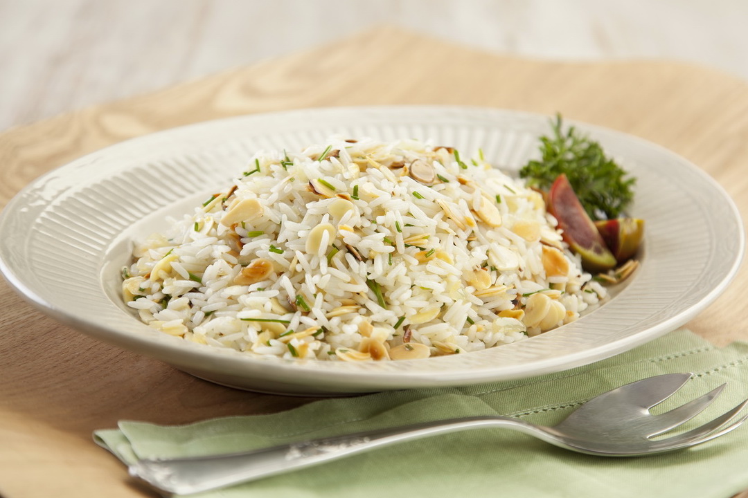 - Solte o arroz com um garfo grande e misture as amêndoas e a cebolinha francesa (cebolete)
