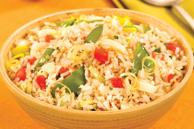 Acrescente o arroz cozido e polvilhe as ervas frescas. Tempere com sal e pimenta, misture delicadamente e sirva em seguida.