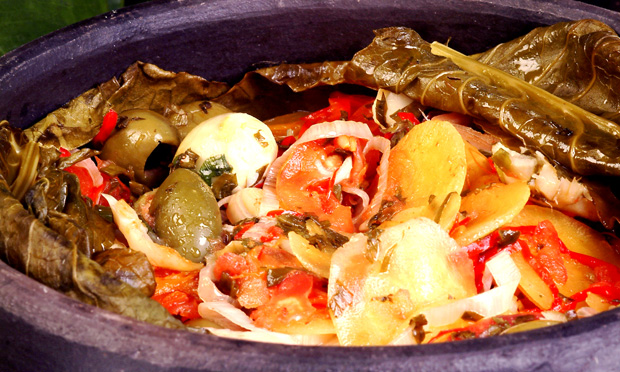 - Coloque em camadas metade das folhas de couve inteiras, a cebola, a mandioquinha, o tomate, a cenoura, o bacalhau, os pimentões e regue com o azeite