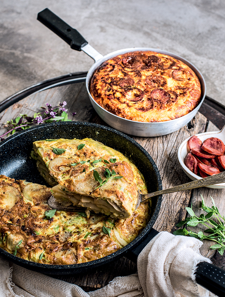 Em uma panela com água fervente, cozinhe a batata em fogo médio por quatro minutos. Escorra, passe em água corrente e transfira para uma tigela. Junte os demais ingredientes, exceto o azeite, e misture. Em uma frigideira com o azeite, cozinhe em fogo médio, com tampa, por cinco minutos. Vire a fritada sobre um prato e volte à frigideira. Tampe, cozinhe por mais cinco minutos e sirva.