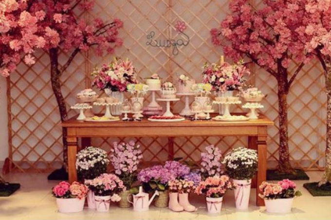 Trazer a temática Primavera para todos os elementos da decoração é importante para dar à mesa um visual mais completo. Defina uma paleta de cores e espécies de flores a serem retratadas nos docinhos e personalizados.