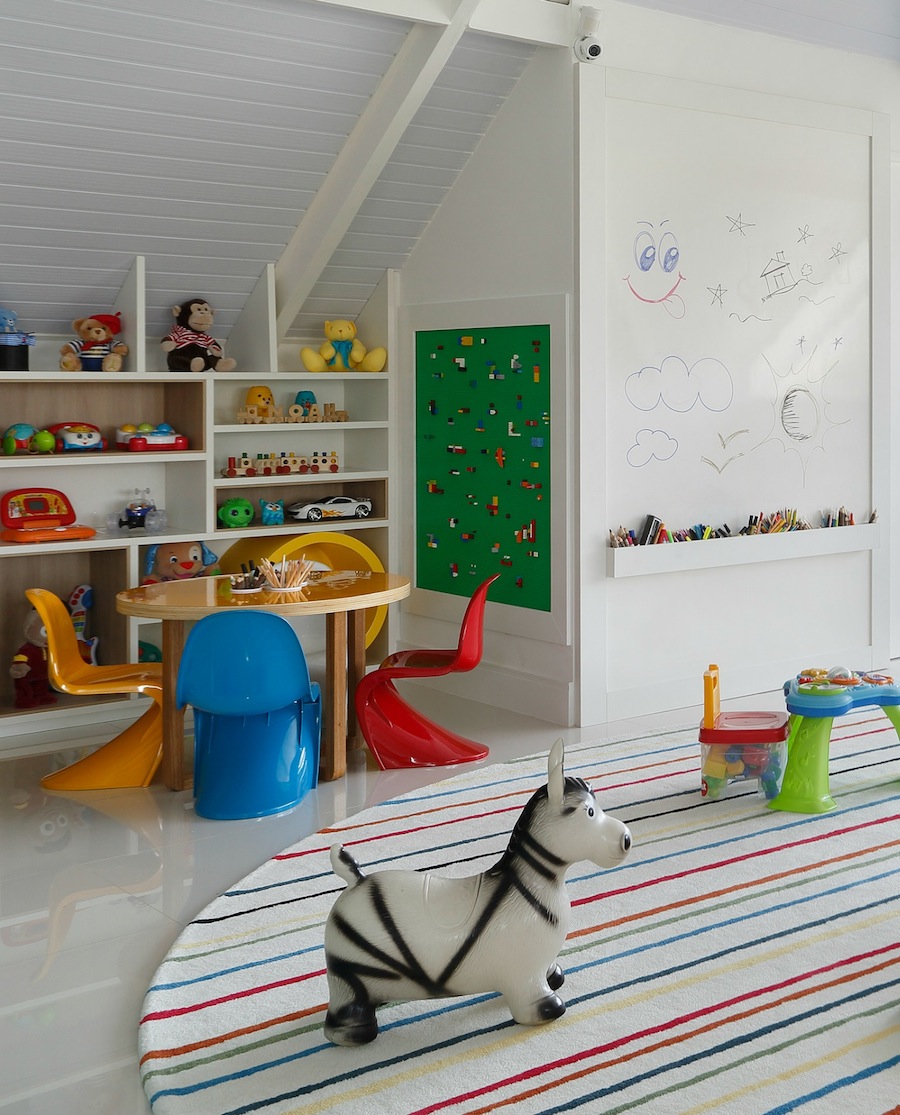 A brinquedoteca feita pela arquiteta Amanda Miranda, em uma casa no Rio de Janeiro, conta com a participação das crianças na decoração. Na parede, o quadro verde de placas de lego permite que os pequenos montem e desmontem figuras dependendo do humor do dia. Além disso, o painel de desenho dá a liberdade deles “pintarem a parede” sem tomar bronca do pai e da mãe.