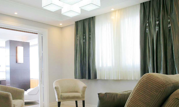 Para a altura do suporte, o ideal é que fique o mais próximo possível do teto. Quando fixadas direto nele, as cortinas e persianas criam um efeito de amplidão no ambiente.